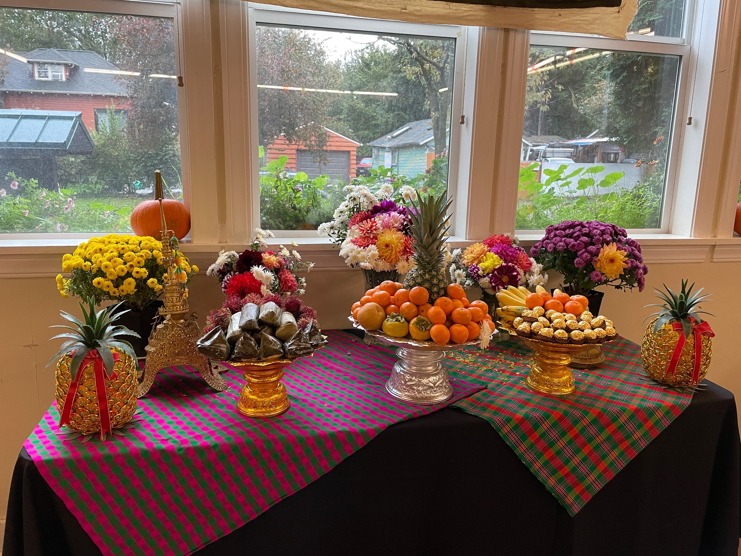 Cambodian Pchum Ben – Pchum Ben, held in mid-October, is a celebration which honors and celebrates those who have passed before us. Similar to Dia de Los Muertos, which is more commonly known in Latin America, and is now celebrated throughout the USA. Our decor for the evening was a beautiful altar table filled with photos, flowers, and traditional items that are taken to the Temple filled with the favorite foods of loved ones who have passed. During this evening we took a longer time with dinner and shared a special Cambodian dessert to commemorate the holiday. The longer dinner time gave Seniors the opportunity to share stories and memories with others about their ancestors and loved ones. After dinner we did what we often do on Mondays, a night of cultural dancing! Pchum Ben was a beautiful celebration!